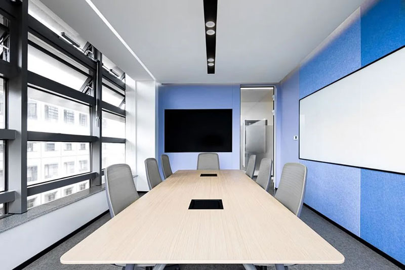 封闭会议室采用玻璃隔断既保留了采光也确保了隔音需求,配合磨砂膜的使用保护了使用人员的私密性。