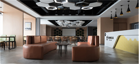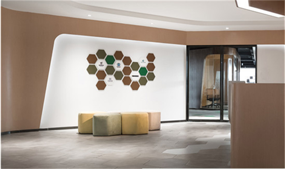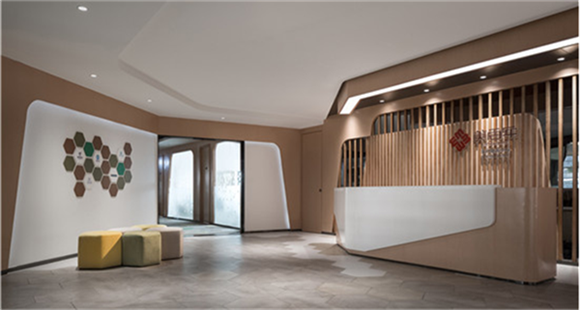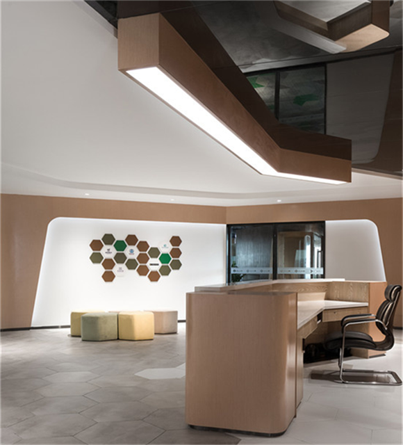 通过空间调度,模糊各个工作区域间的界限,打造既开放、又不乏私密性的办公区。除此之外,曲线与直线在空间共存,线条的形式感使办公室充满现代化与创意十足,极大的在视觉上满足了客户的营销诉求,构建来人第一感性认知。