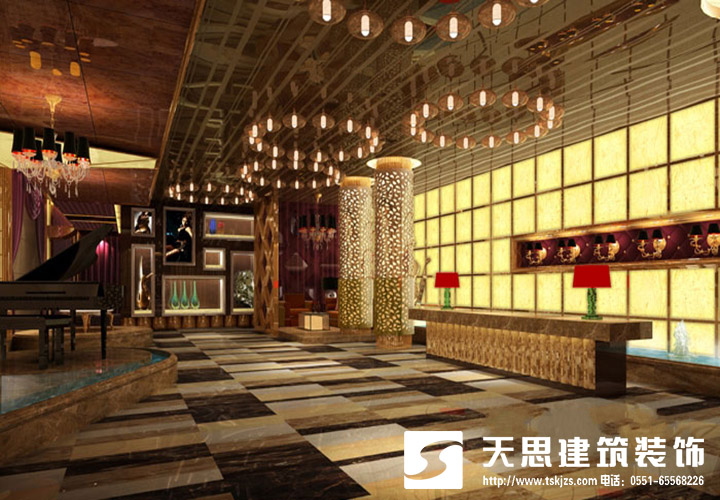 项目名称:合肥潮流KTV装修设计 设计面积:800平方 项目地址:安徽省合肥市 合肥潮流KTV装修设计,金铜色的灯光耀眼而又温馨,大理石般的地板,更是衬托出了大厅的
