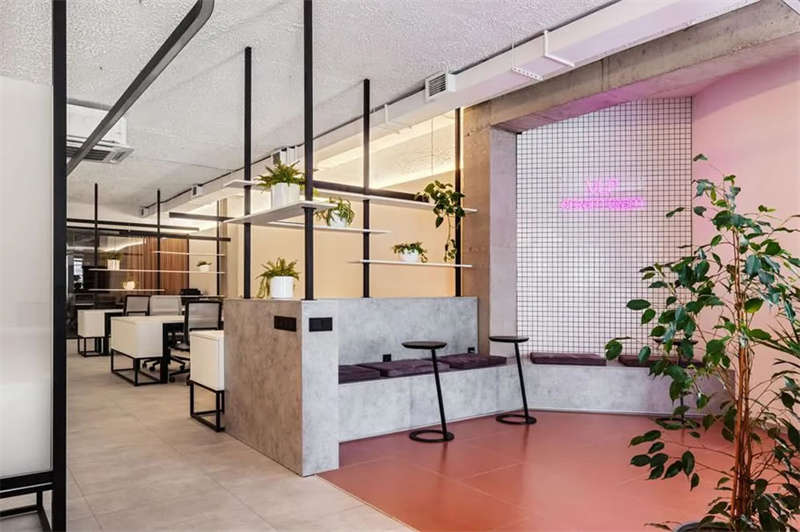 浅灰色的顶面与地面,配以白色墙体和主体办公家具,再辅以缜密的灯光照明,让室内呈现明亮纯净的光彩质感;黑色线性元素的加入丰富了空间构成和视觉趣味性;唯一的暖棕色彩的点缀让空间更灵动更富有层次感,也为纯净极简的空间带去一抹温暖气息。
