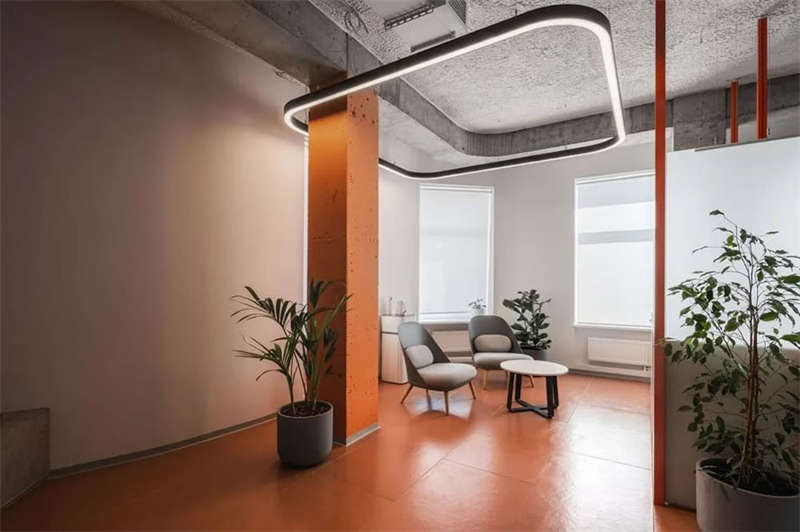 一种是沿办公室周边设置了一圈灯带,灯光从白色天花板上反射出来,散发出令人赏心悦目的温暖漫射光。还有一种线性照明形式呼应流线型的建筑轮廓,将整个办公室从入口区域连接到行政工作区。另一个这样的设计元素出现在厨房区,当阴天自然光不足时可以照亮这里的空间。此外,每组工位都有一个独立光源,如有必要,每个员工都可以自行打开或关闭。