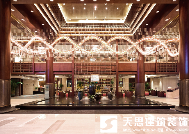 大堂的另一个风格以抽象的格栅为装饰,在中央景区的水景以宁静来突出水的主题,并以木格栅与水景组合成抽象的构成。吊灯以水泡灯作为装饰,有温泉气泡的隐喻,突出酒店设计的主题。