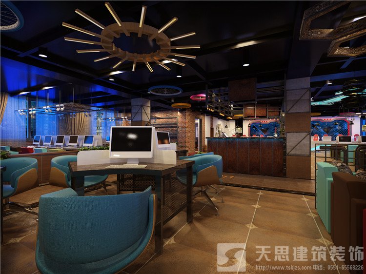 3、网咖的设计应该涉及到每一个点、线、面,保证每个地方都没有疏漏,还要突出与众不同的个性化特点。比如墙面可以做大型喷画和网咖LOGO,或喷涂成符合网咖装饰格调的颜色,保证网咖整体视觉的大气和舒适。