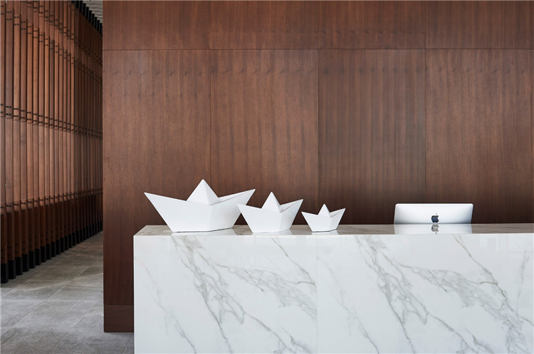 大堂和餐厅的内部特色是光滑的白色石膏墙壁、大理石、黄铜和深色的木材家具。这里用了一个白色,纯净,简单的立面,走进里面,仍然会感觉到白色,但同时我们使用了一些其他的材料。所有的颜色都来自真实的材料,让你进入室内时更温暖。