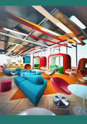 办公室装修主题色彩设计,办公室设计主题就是色彩,长长的彩条作为照明器具纵横于天花板上,弥补了大面积裸露天花板的空缺,家具色彩的搭配和长长的彩条相呼应,整个办公空间色彩鲜