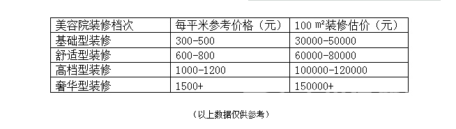 在美容院这个行业当中,基础装修的定义是要在实用的基础上,满足美容院的各种功能。这一类装修并不会在视觉美感上有过多的追求,其主要特征是简单、大方。根据二三线城市的消费水平来看,这种档次的装修费用大概在一平米300-500元左右,如果美容院的店面规模大于100㎡,那么大概的装修费用应该在三万到五万元左右。