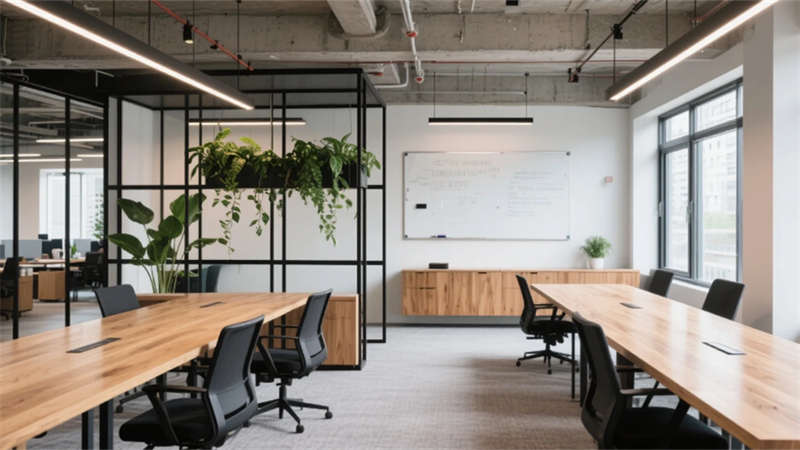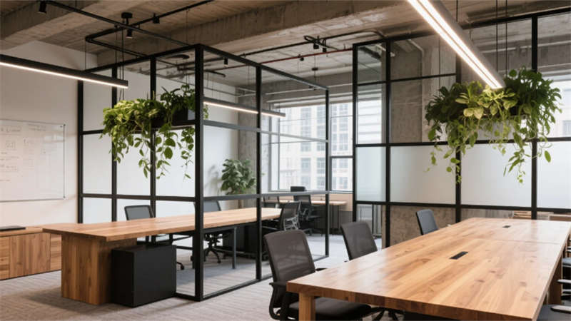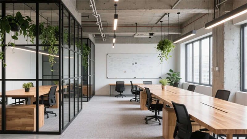 该办公空间以暖调轻工业风为灵魂,将冷峻的金属骨架与温润的竹木元素交织,在微水泥的灰调基底上铺陈出理性与感性的平衡。开放办公区借落地窗引光入室,绿植墙与轨道灯串联起流动的协作场景;独立专注舱与水吧区形成动静分区,满足深度思考与即时社交的双重需求。