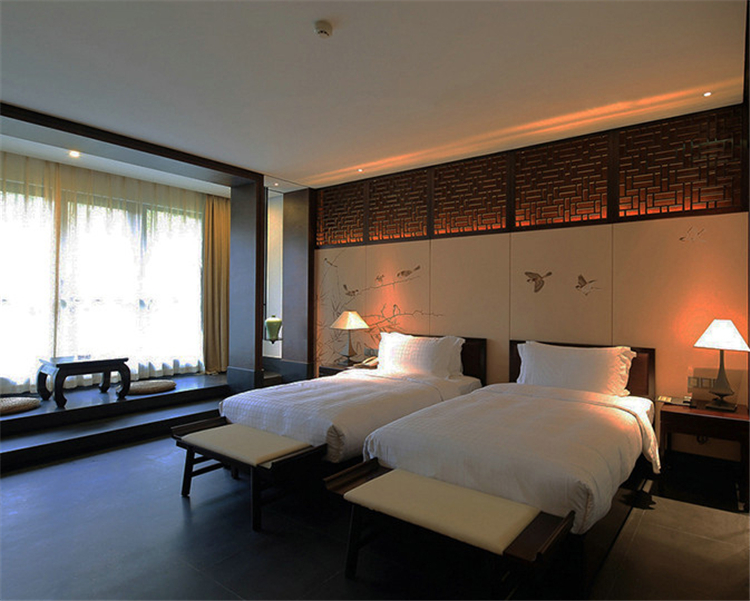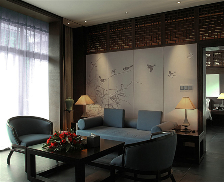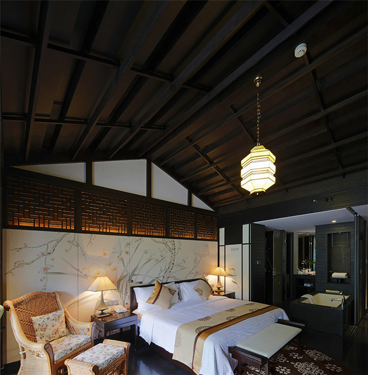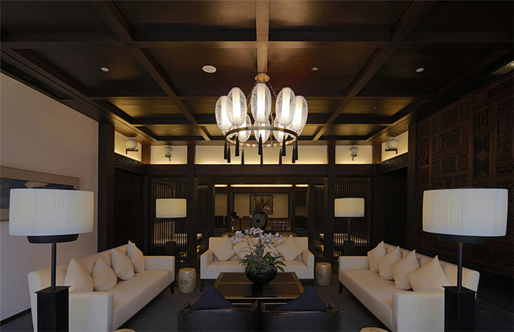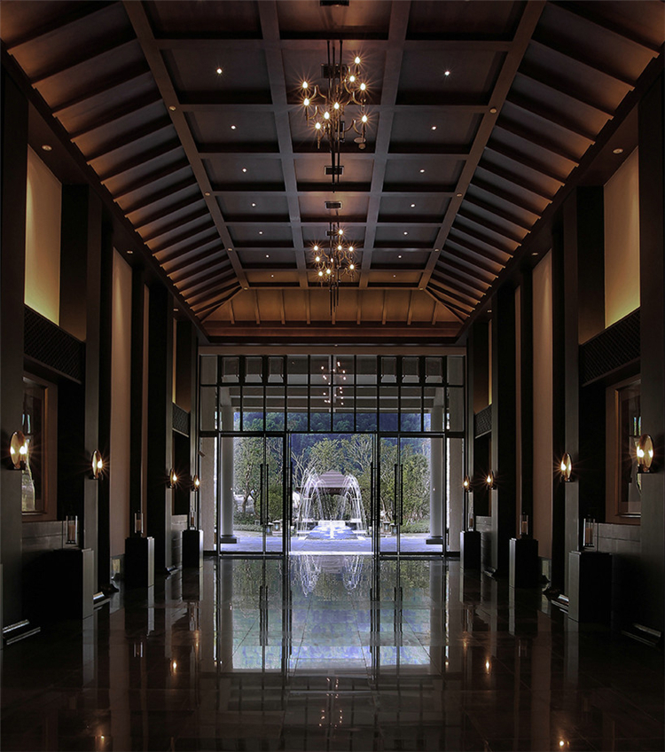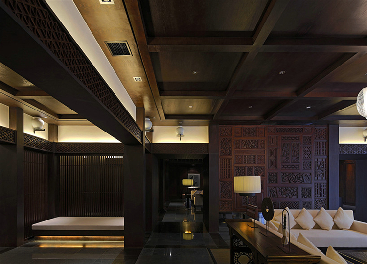 走入大堂,室内空间宽阔,天花鳞次栉比通向楼梯方向,墙面灰色石材雕刻,将桃花源记中的诗句映入客人眼帘,禅境古意扑面而来。镂空屏风隔墙的设计,让空间隔而不断,与具有传统韵味的家具和配饰相互交融,打断俗世的纷扰。柱子和天花上的装饰灯具,利用金属和木材两种截然不同的材料和质地,创造空间内在张力,透过锐利的金属、细腻的木质线条强调空间结构,精致笔挺的吊灯,令空间由内向外展现独特魅力。