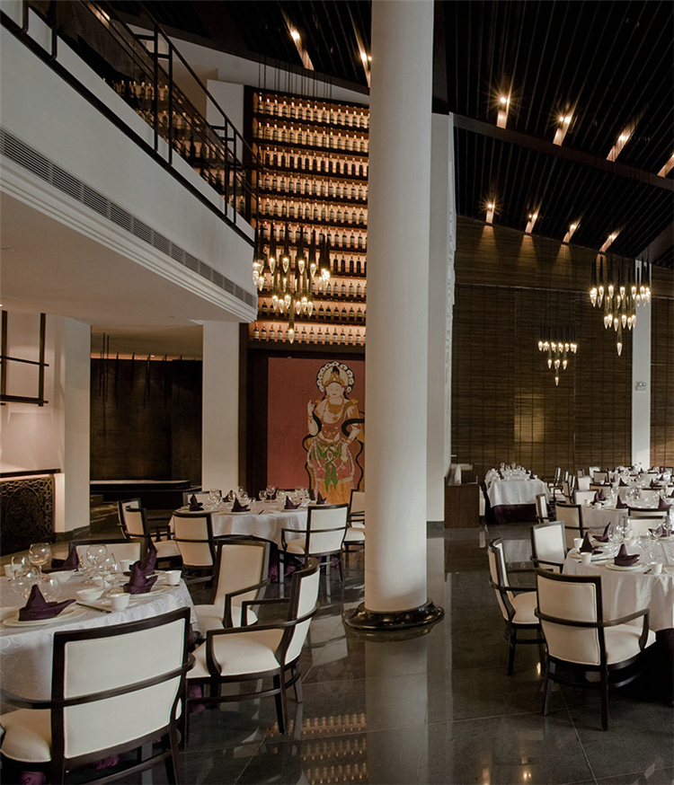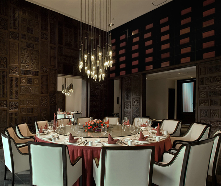穿过悠长的走道,在灰白色空间配合温暖沉着木色格子窗棱,让客人逐步感受一种优雅的热情。天花的黑色线条设计,带有极强的导向性,墙面上特别设计的壁灯,与柱体结合,极大地丰富整个空间的层次感和趣味性。