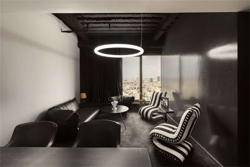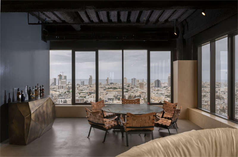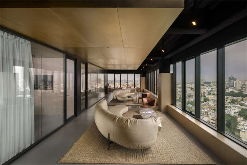 盒子面向“起居室”,这是一个开放空间,有各种座位,一个活跃的酒吧作为办公室的中心。