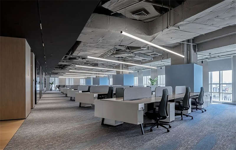 穿过会议区进入开放办公区阔然开朗,色调由黑变浅,层层律动的地面纹理将蔚蓝海洋天空的自然气息引入到空间,律动的线性灯光交织辉映描述了Arm科技之源越过海洋略过山川的伟大之旅,植物和木色的点缀让空间赋予对自然和科技的尊崇和平衡。