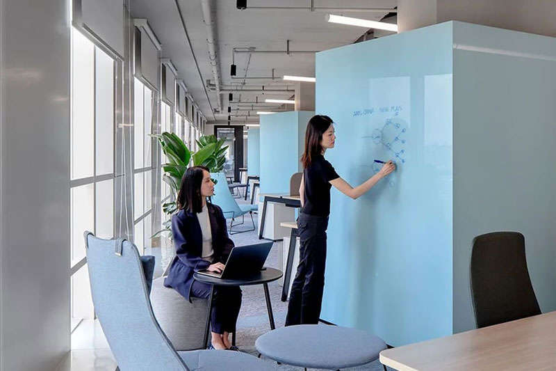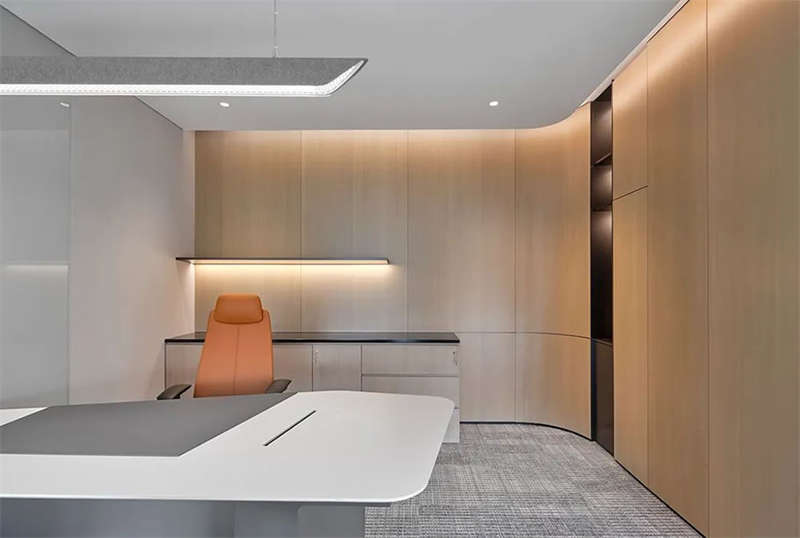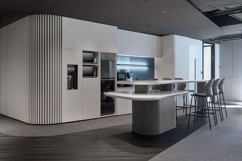 由于建筑不是专业写字楼,全开放的租赁面积、过大的柱体、凌乱的工业管道天花也给设计提出了难题。为了平衡好行政办公和会客及不同部门之间的功能分区,设计师把打印、咖啡、小洽谈休憩空间作为功能岛置入整层的正中,合理分隔东西两个工区并方便大家便捷使用。沿窗的柱体通过装饰面的包裹和扭转形成空间亮点,辅以休闲家具,简短的洽谈分享、小的会议讨论在此得以解决,员工在介于室内空间和自然窗光中获得了独特的体验和助益。