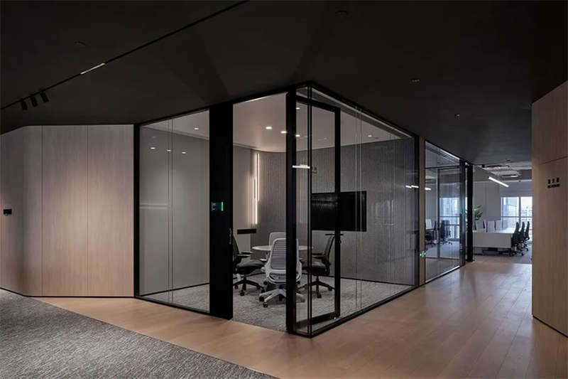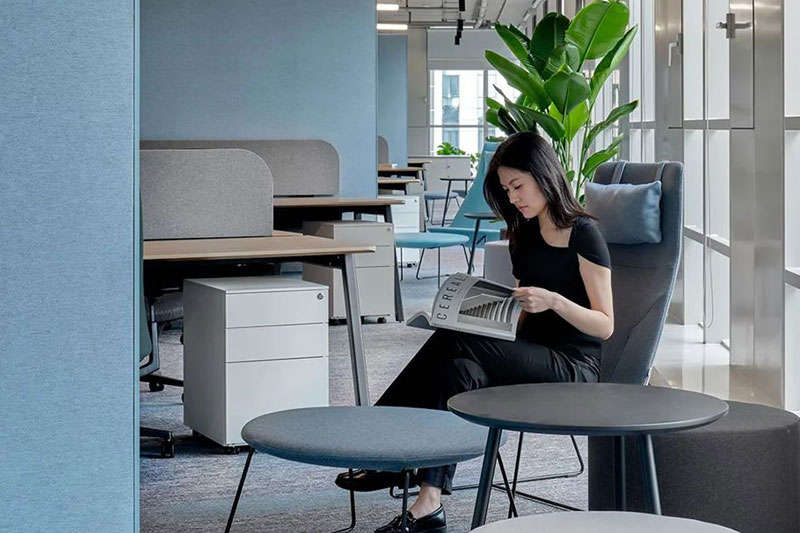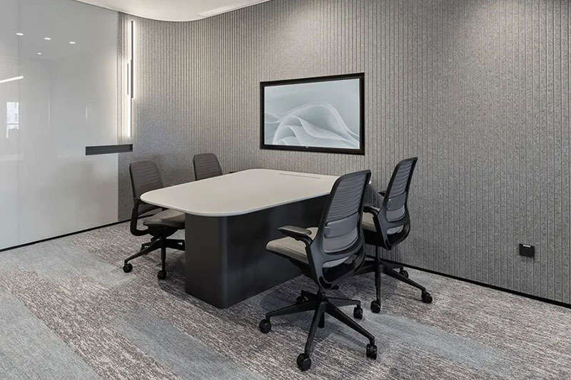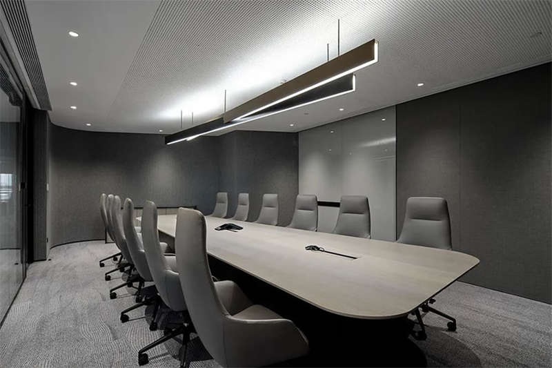 进入会议空间,设计师刻意控制它的视觉张力,前区的体验得以延续,灰黑色调覆盖目力所及并引入更多的柔性材料,专业、专注是会议空间的功能立本但也不乏我们对活力元素的照拂,每一个会议室我们都选择了形式各样的蓝色地毯来装点。