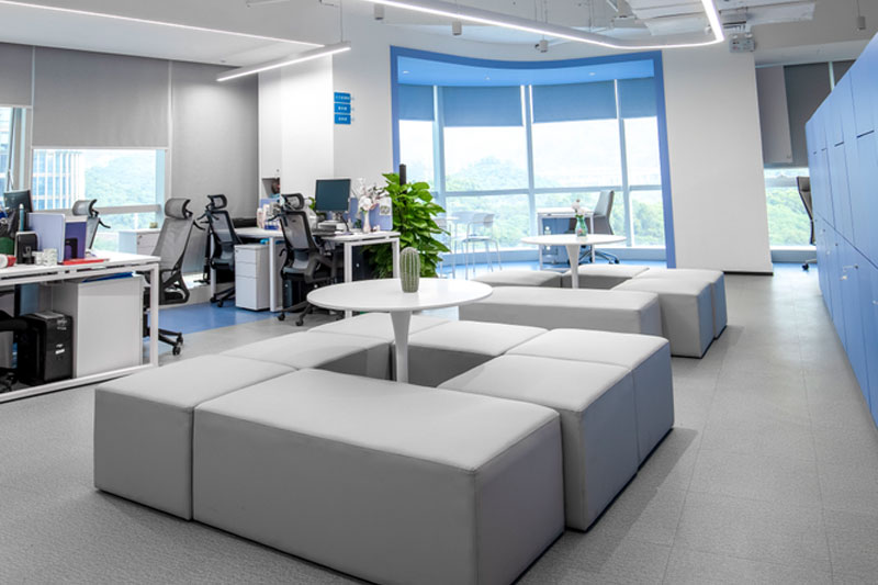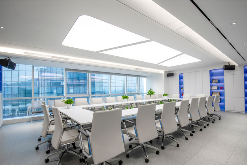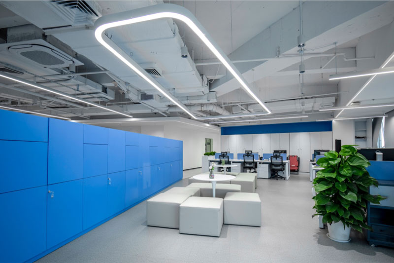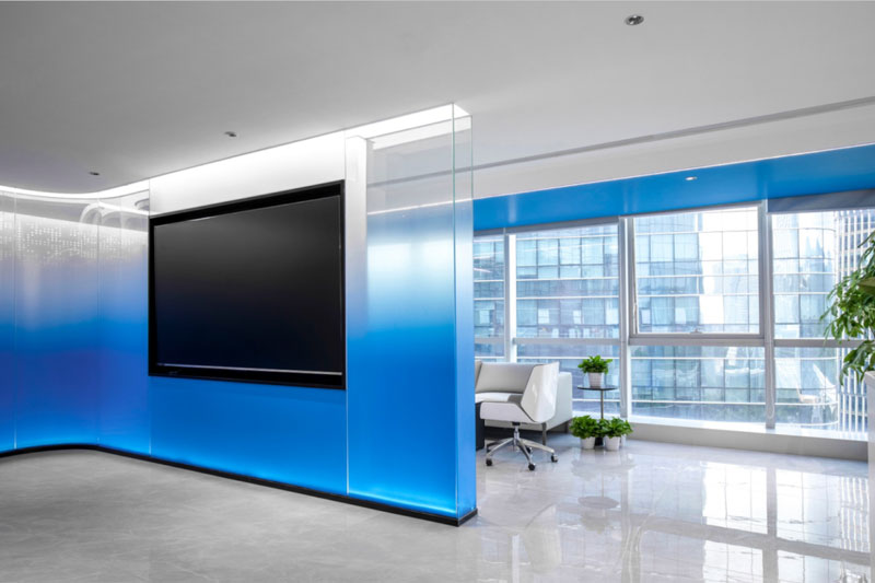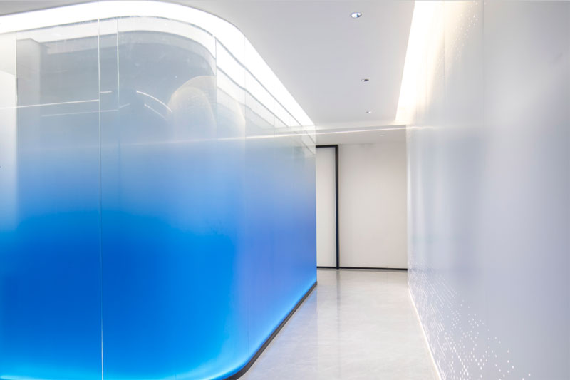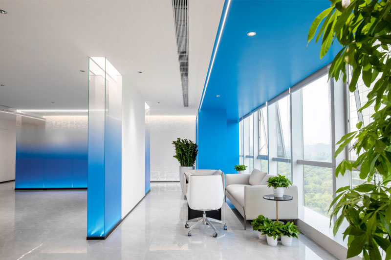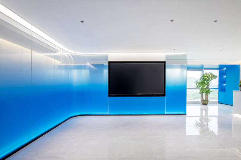 为了体现客户的品牌形象和影响力,设计师将“创新、科技、便捷”的理念融入到空间的每个环节,从企业的VI色中提取出蓝色运用到整体空间中。