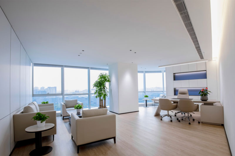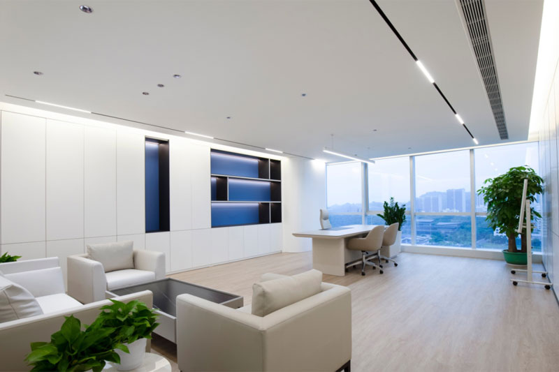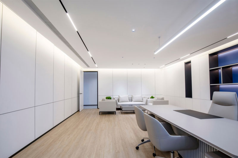 总裁办整体空间体块分明,大面积的木饰面体现出品质和细节,蓝白的色调与空间功能的巧妙搭配,轻盈的空间荡漾着优美的旋律感。