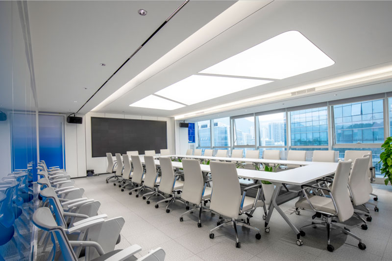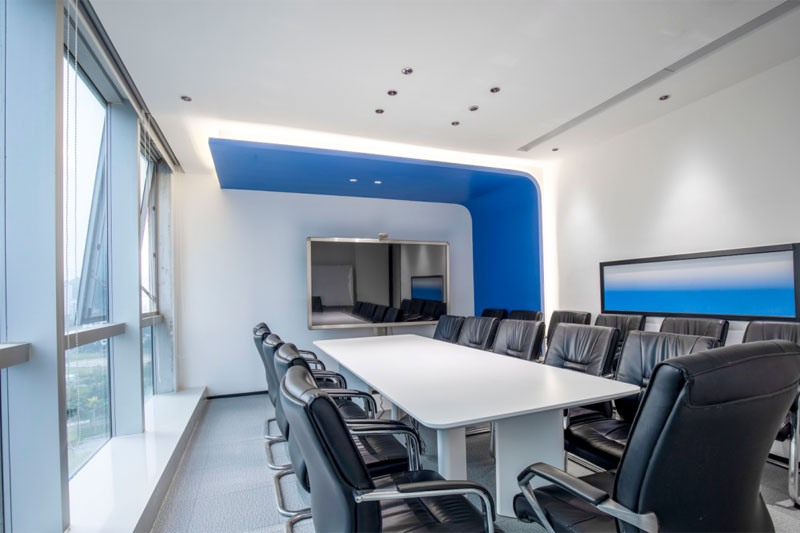 大小会议室都延续了空间的蓝色基调,利用通透的蓝色玻璃分隔过道,使空间更加通透明亮,不仅让视感增强,也深刻的加强了品牌形象在访客心中的作用。