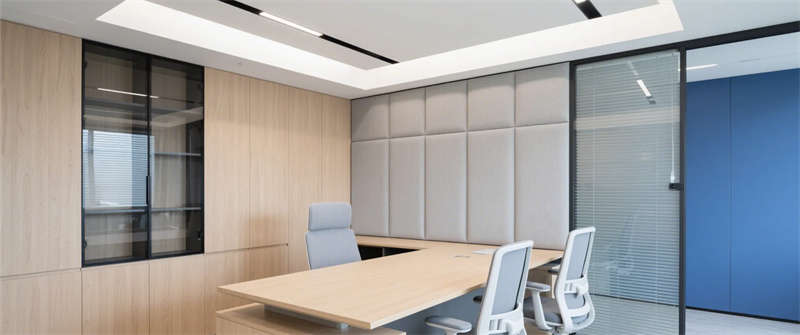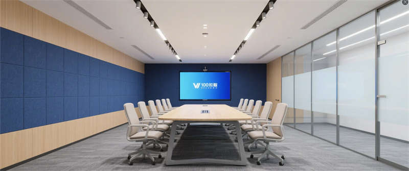 智能会议室:深蓝色吸音墙面呼应企业VI色,智能屏幕与玻璃隔断凸显科技属性;