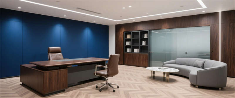 总裁办公室:人字拼木地板与深胡桃木家具提升质感,深蓝艺术漆背景墙强化品牌识别;