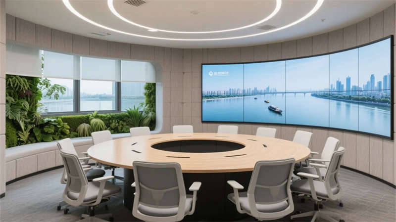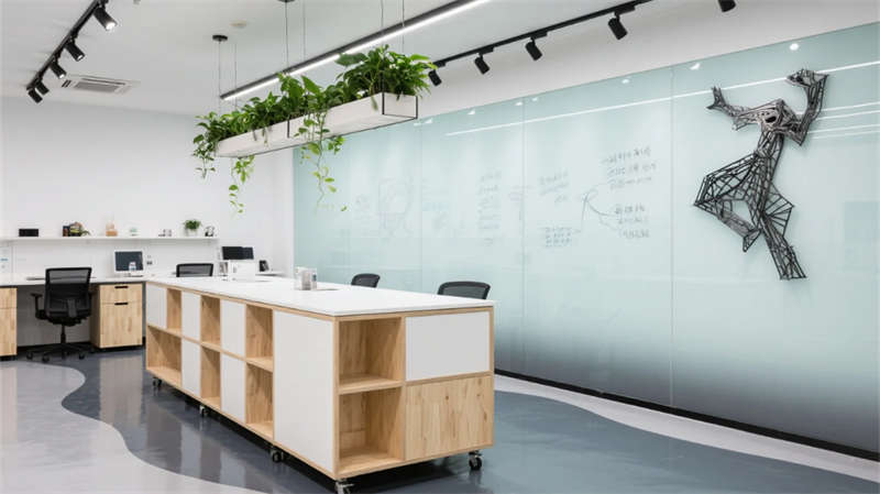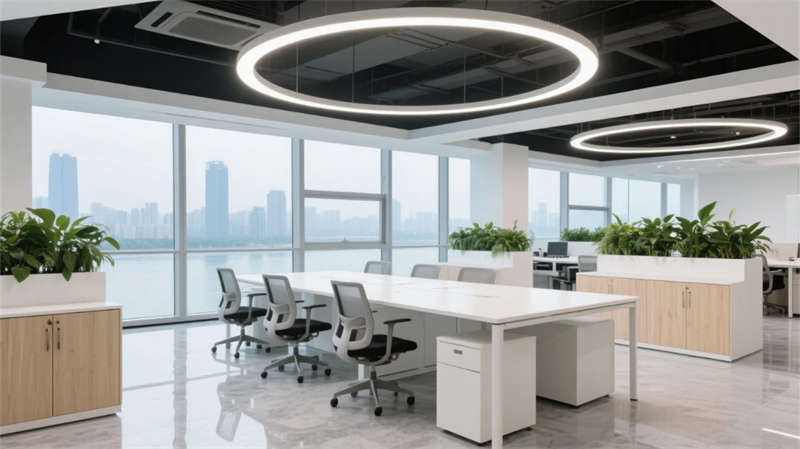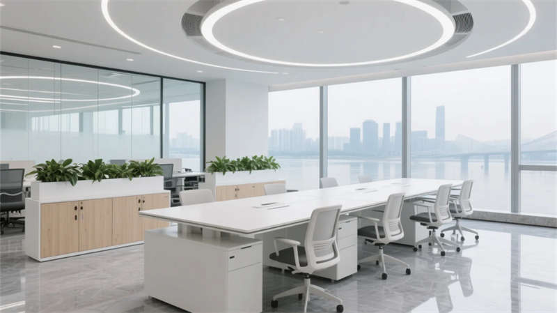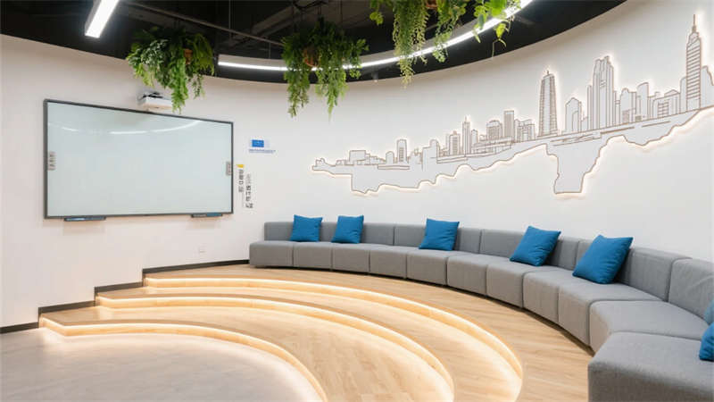 开放办公区以模块化绿植隔断柔化边界,智能会议舱曲面屏动态呈现江岸线,赋予协作以在地诗意。创意实验室的可书写玻璃墙与磁吸家具激发即兴创造,而阶梯沙龙区弧形灯带如江水蜿蜒,引导思想交汇。