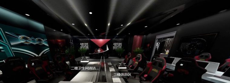 从一楼比赛区的旋梯进入二楼会客区和走道休息区,两个休息区域用不同的辅色来彰显不同空间的性质,相同的是都用线条和具有层次感的吊顶来加强空间感,休息区的绿植也可以适度缓解视觉压力。