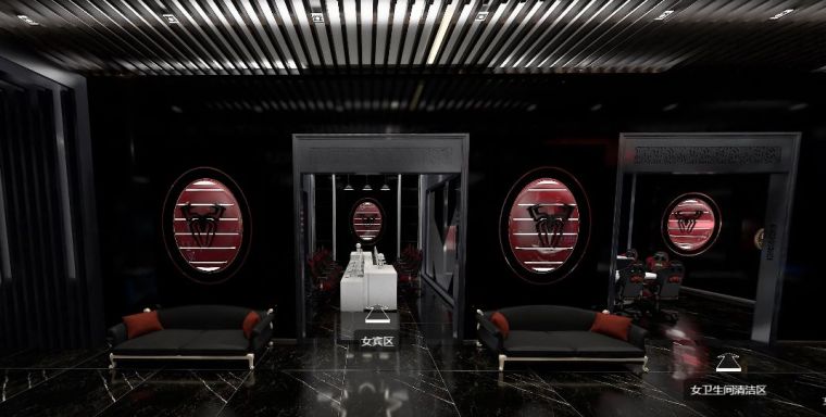 在迎宾区两边,左右分布着男宾区和女宾区。相较于普通网咖设计,电竞会馆具有赛事承办上的专业特色,为了使人更加有比赛所需专注,男宾区墙面只有简单的涂鸦,饰物元素也极少,相较于男宾区设计较为简单,女宾区“红蜘蛛”主题感十足,顶墙灯光合理搭配来减少黑色来的的压抑感。男女独立卫生间分别分布在两个区域,非常人性化。