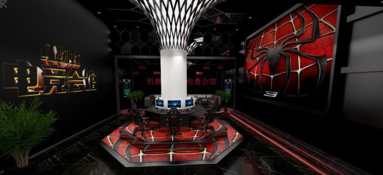 从迎宾区直接进入后,来到最为核心的竞技比赛区,满足电竞游戏里开黑等座位聚集需要,非常创意性地在空间中加入了圆柱设计,空间里最大亮点是圆柱台有规律交错的线条与“红蜘蛛”背景墙交相呼应,打造了成为了“蜘蛛网”的元素,让整个核心空间与主题完美契合。