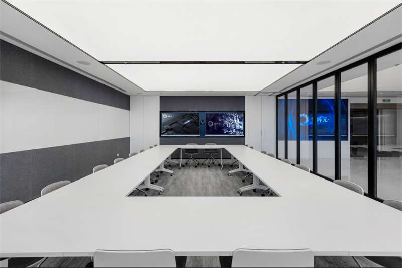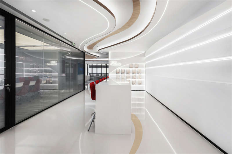 整个空间呈现出轻盈的姿态,大面积留白给予空间呼吸感,曲线流动的造型就像一根善于变化而纤细不惊的丝线,即将牵引出一次次关于未来的探索。