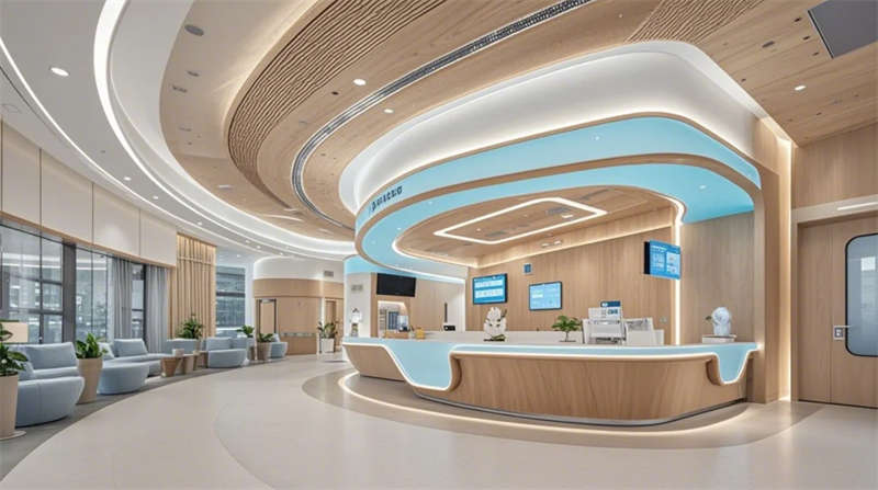 空间设计深度融入院感防控要求,全区域采用环氧树脂自流平地胶与抗倍特抗菌板材,医技区双通道设计实现洁污分流。智能系统贯穿全场景:手术等候区的动态光环境调节、康复花园的感应式照明、急诊通道的电子玻璃隔断,彰显科技医疗时代特征。设计团队特别注重心理疗愈,270度观景等候区、水景冥想花园、减压艺术装置等创新节点,重构了传统医疗空间体验,塑造兼具专业信赖感与情感温度的新型现代医院范本。