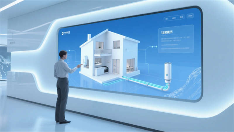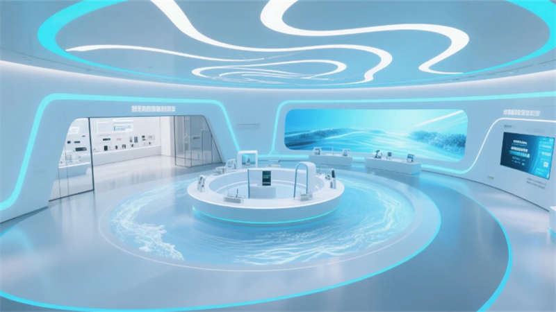 展厅以环形动线串联六大核心模块:入口10米宽LED水幕墙动态演绎净水原理;中央悬浮式产品矩阵展台,通过全息投影拆解RO膜过滤技术;实景化场景区1:1复刻家庭厨房、商务办公楼及工业厂房,搭配交互式水质监测实验台;独创的“虚拟管家”AR系统,可生成个性化净水方案并投射至合肥典型户型模型。空间顶部采用参数化设计的波浪形灯网,象征长江与淮河水系交汇,地面嵌入城市节水数据可视化地砖,凸显本土环保责任感。