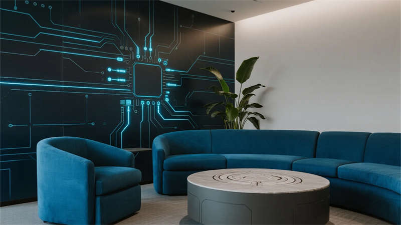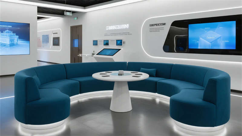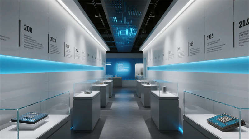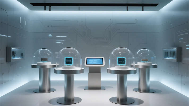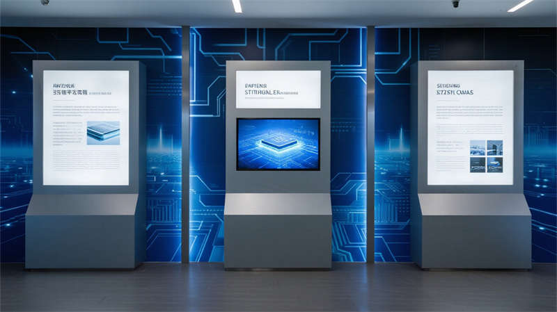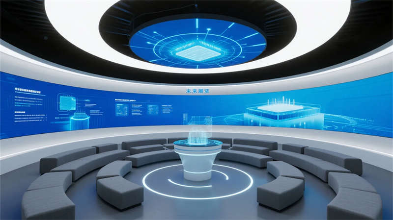 该半导体企业展厅以现代简约风格为核心,通过流畅空间布局与高科技元素,打造沉浸式科技体验。设计突出半导体技术的抽象表达,利用蓝色与灰色调营造冷静、专业的氛围,同时融入玻璃、金属材质增强通透感。入口区以悬浮雕塑引导视线,产品展示区通过简约玻璃柜和触屏互动,生动呈现技术精髓;技术创新墙以动态图文展现工艺演进,历史廊道则以线性叙事唤起行业记忆。互动区和未来展望区强调参与性,采用环形屏幕与全息投影,让访客直观感受创新应用。休息区与演讲区注重人性化,简约家具结合微光纹理,提供舒适交流空间。整体设计摒弃繁复装饰,以干净线条和光影变化强化空间流动性,不仅传递半导体领域的精密与前瞻性,更通过美学融合提升教育性和观赏性。展厅作为科技展示平台,旨在激发探索兴趣,体现企业对创新文化的重视。